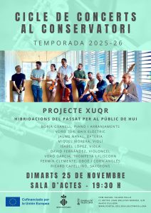 «Projecte Xuqr» Ciclo de Conciertos en el Conservatorio 2025 – 26 «Hibridaciones del pasado para el público de hoy». Fecha: 25 de noviembre. Hora: 19:30 h. Lugar: salón de actos del CPM Rafael Talens Pelló (c/ Metge Joan Bolufer Borràs, s/n). Entrada libre hasta completar aforo.