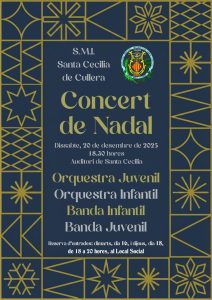 Concierto de Navidad SMI Santa Cecilia Orquesta Juvenil, Orquesta Infantil, Banda Infantil y Banda Juvenil. Fecha: 20 de diciembre Hora: 18:30 h Lugar: Auditorio de Santa Cecilia (c/ del Riu, 7) Reserva de entradas: 16 y 18 de diciembre de 18:00 h a 20:00 h en el Local Social