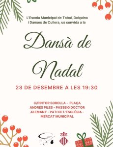 Danza de Navidad La Escuela Municipal de Tabal, Dulzaina y Danzas de Cullera Fecha: 23 de diciembre Hora: 19:30 h Itinerario: c/ Pintor Sorolla, pza Andrés Piles, paseo Doctor Alemany, patio de la Iglesia, Mercado Municipal