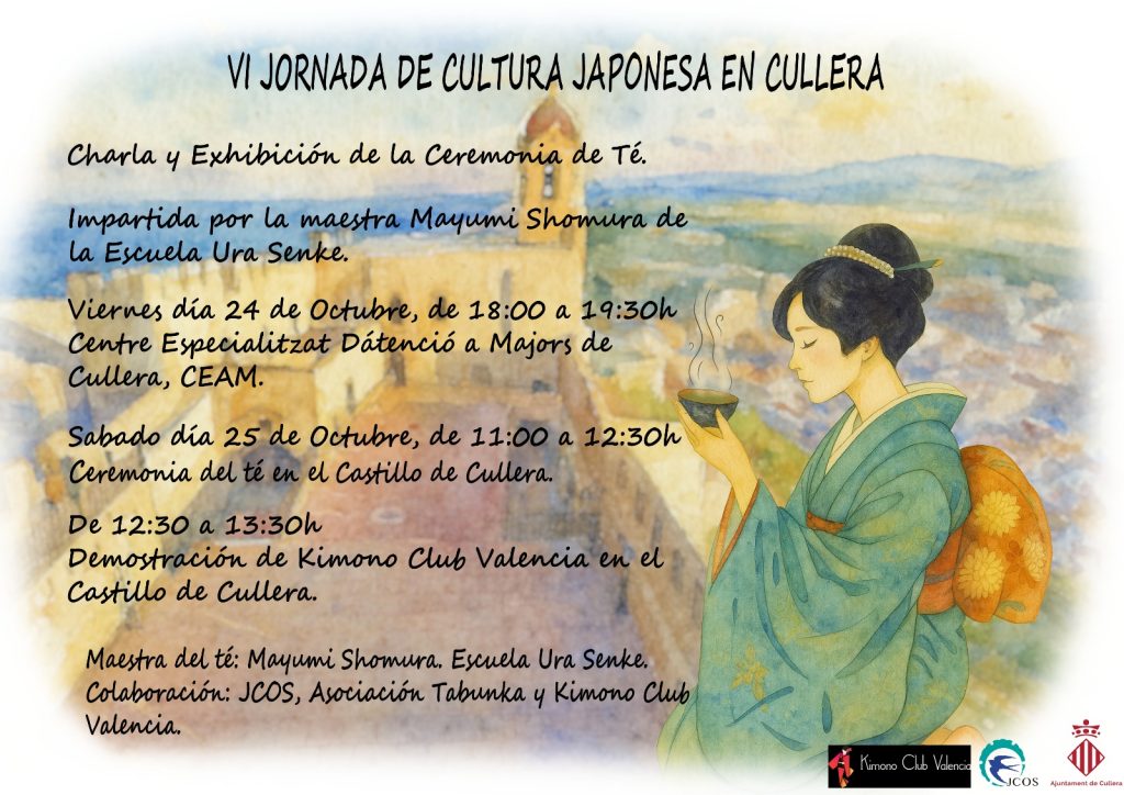- 18:00 h a 19:30 h Charla y exhibición de la ceremonia del té en el centro especializado de atención a mayores de Cullera, CEAM.